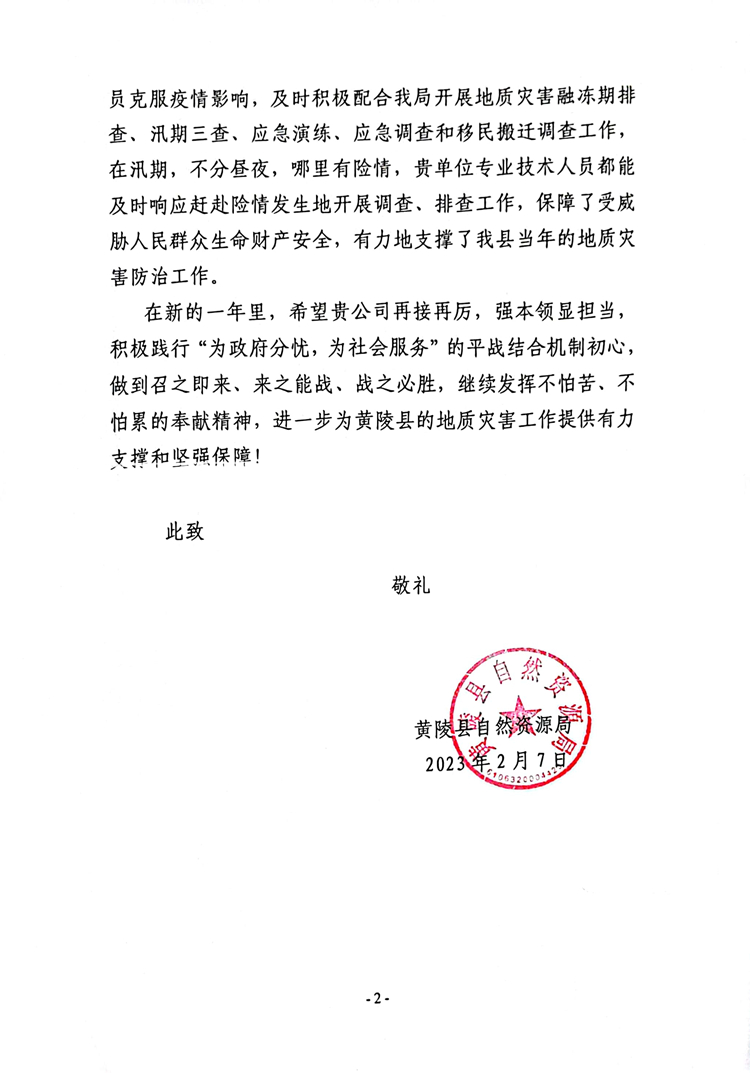 一封感謝信,紙短情長。2月17日,陜西工勘院收到一封來自黃陵縣自然資源局送來的感謝信,這對公司平戰(zhàn)結(jié)合技術(shù)支撐組各位成員來說既是“意外驚喜”又在“意料之中”,是對我公司平戰(zhàn)結(jié)合技術(shù)支撐工作的認(rèn)可,更是對公司地質(zhì)災(zāi)害防治領(lǐng)域技術(shù)實力的肯定。